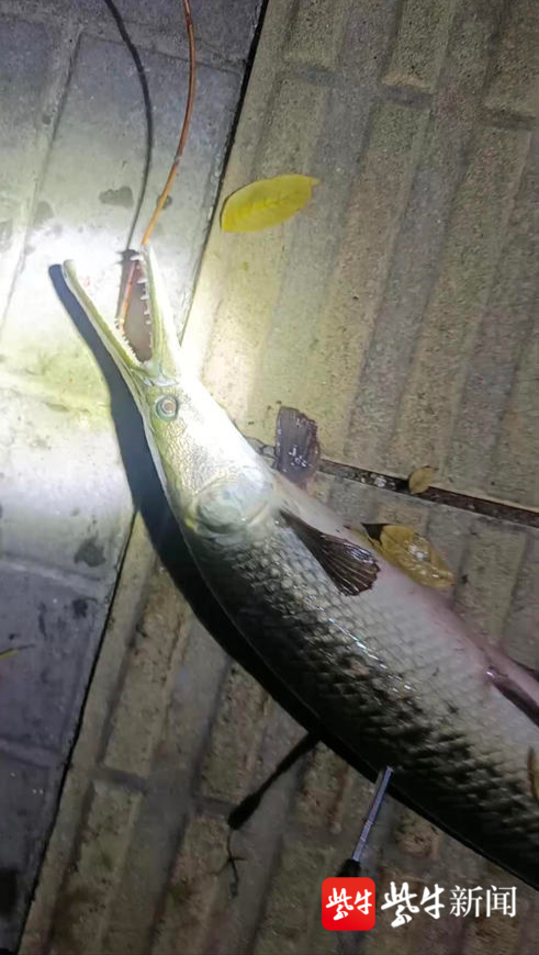 “当时这条怪鱼就浮在水面上,旁边的行人用砖块砸了几下,它才潜入水底。”当晚,梅女士就把拍到的视频发布到了抖音上,引来众多网友和钓鱼爱好者的关注。梅女士说,10月2日晚上,一位网友通过私信给她发来信息称,水渠里的怪鱼就是鳄雀鳝,晚上8点左右已被徐州的一位钓鱼高手擒获。