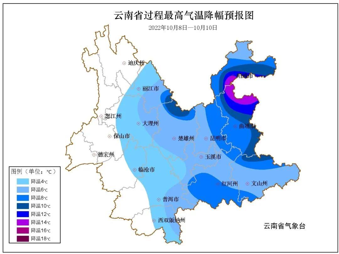受强冷空气和偏南暖湿气流共同影响,预计10月8日夜间到10日,云南省自东向西将出现强降温降雨天气,中部和东部日最高气温下降6℃到8℃,昭通南部、曲靖北部下降12℃到14℃。