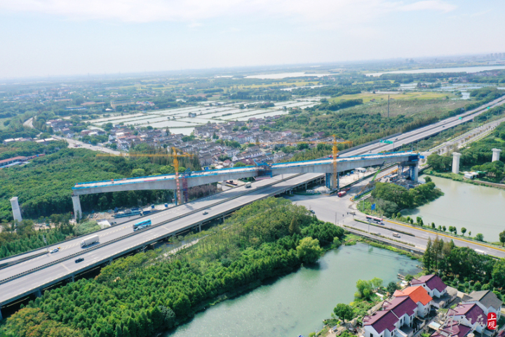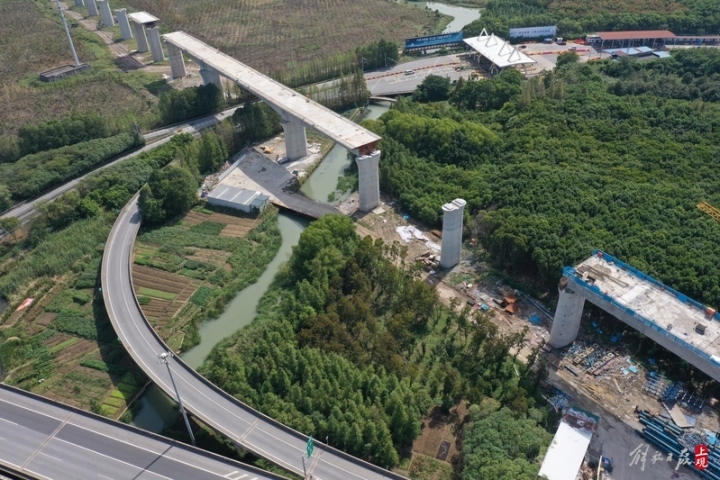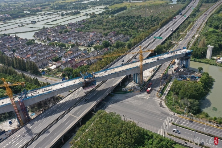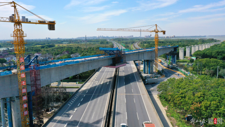 2022年10月10日,由中铁十四局承建的沪苏湖高铁全线控制性工程青浦特大桥金泽桥段,主跨跨越G50沪渝高速、边跨跨越东航路的连续梁,以悬灌梁方式相向浇筑完成合龙。此后,其余桥段将铺设标准预制梁,如今平均每天约有三片箱梁,自苏州吴江向上海青浦方向进行架设,本月中旬将完成元荡湖内所有的架梁作业,与这段现浇梁完成衔接。