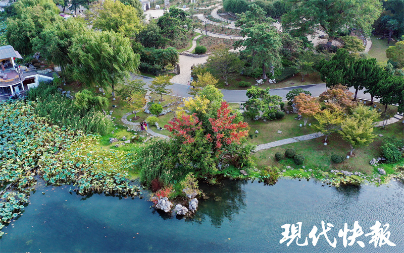 这处三色乌桕树的美景,与中国著名的园林设计大师朱有玠颇有渊源,这里的园林景观便是由他亲手设计的。用太湖石做驳岸、景观树池,在附近种植蓼科植物,为它锦上添花。蓼花和太湖石与滨水而居的三色树交相辉映,将温柔似水的秋意淋漓展现。