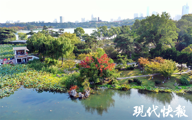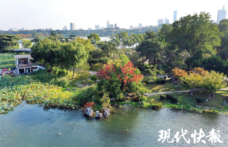 现代快报讯(记者张然/文施向辉/摄)都说南京玄武湖的醉人秋色,从一株三色树开始。眼下,位于环洲月季园北侧的三色树已经率先妆点,绿色、黄色、红色的树叶在一株乌桕树上汇聚,仿佛是秋姑娘打翻了调色盘,预计10月下旬进入最佳观赏期。