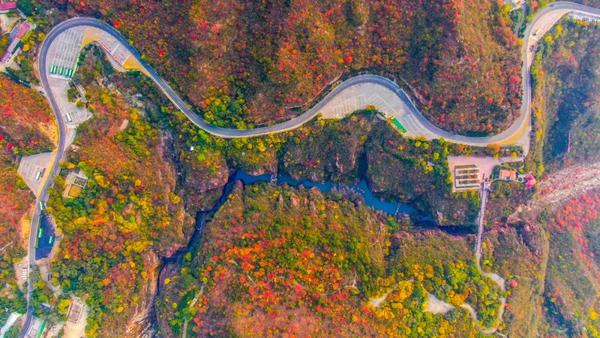 河南云台山进入观赏红叶的最佳季节。万亩红叶红似骄阳,灿若云霞,美不胜收。每年十月中旬至十一月中旬为最佳观赏季节,从山顶俯瞰,连绵不断的山峰秋色盈金、树叶流丹、层林尽染。鲜艳夺目的秋叶色彩斑斓,红、橙、黄等多种颜色层次分明、错落有致,深深浅浅的色彩犹如打翻在山间的调色盘;盘山公路穿梭其中,像一条美丽的彩带,呈现出一幅绚丽多彩的秋日山水画卷,画面颇为壮观!