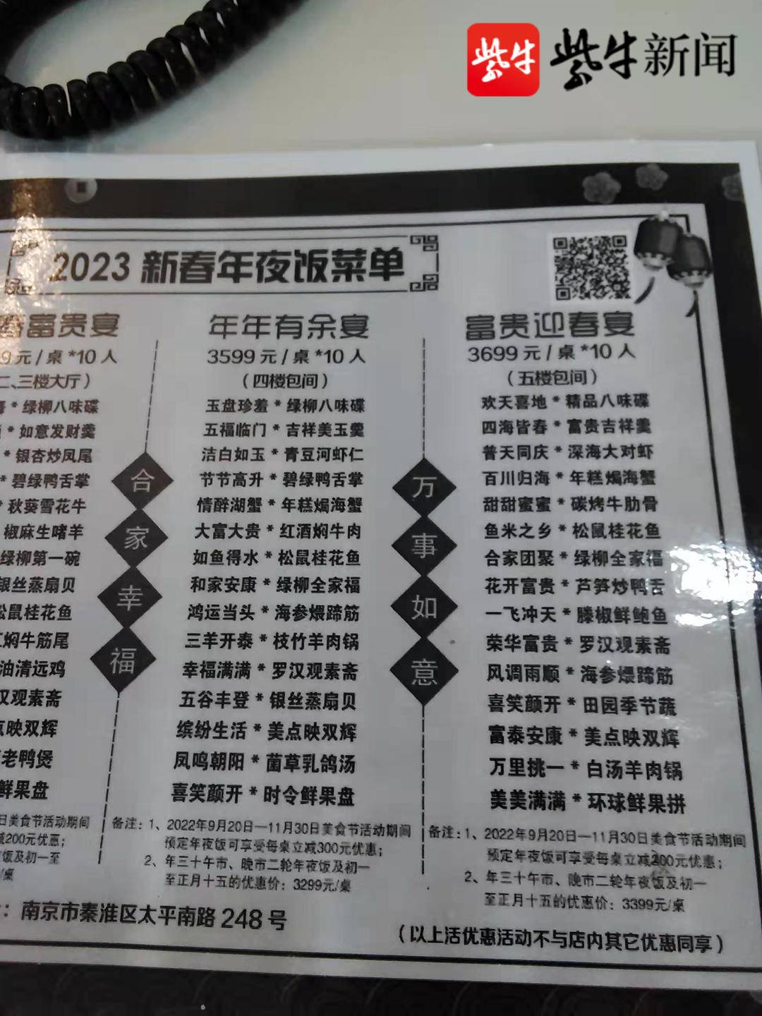 位于太平南路的老字号绿柳居10人的包间标准有3599元/桌的年年有余宴和3699元/桌的富贵迎春宴,18—20人的大桌标准为6888元/桌。绿柳居的年夜饭菜单显示,9月20日—11月30日期间预定年夜饭可享受立减优惠。而年三十午市、晚市二轮年夜饭以及正月里的餐宴,价格则会便宜些,比如年年有余宴会降为3299元/桌,富贵迎春宴会降为3399元/桌。
