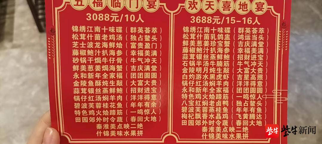 “大包间基本上都已经订满了,只有一楼8—10人的包间和大厅了。”位于建康路68号的永和园酒楼是家老字号餐饮店,工作人员告诉记者,从国庆就开始接受年夜饭预定了,目前包间只剩一楼8—10人的包间了。记者注意到,永和园的年夜饭套餐价格从1388元到4588元。其中,4-6人套餐为1388元,15-26人的欢天喜地宴为3688元,16-18人的七星璀璨宴为4588元。10人有2388元和3088元两种标准可以选择。“需要订包间的,现在就要来交定金的,定金就是全额付款。“工作人员说。