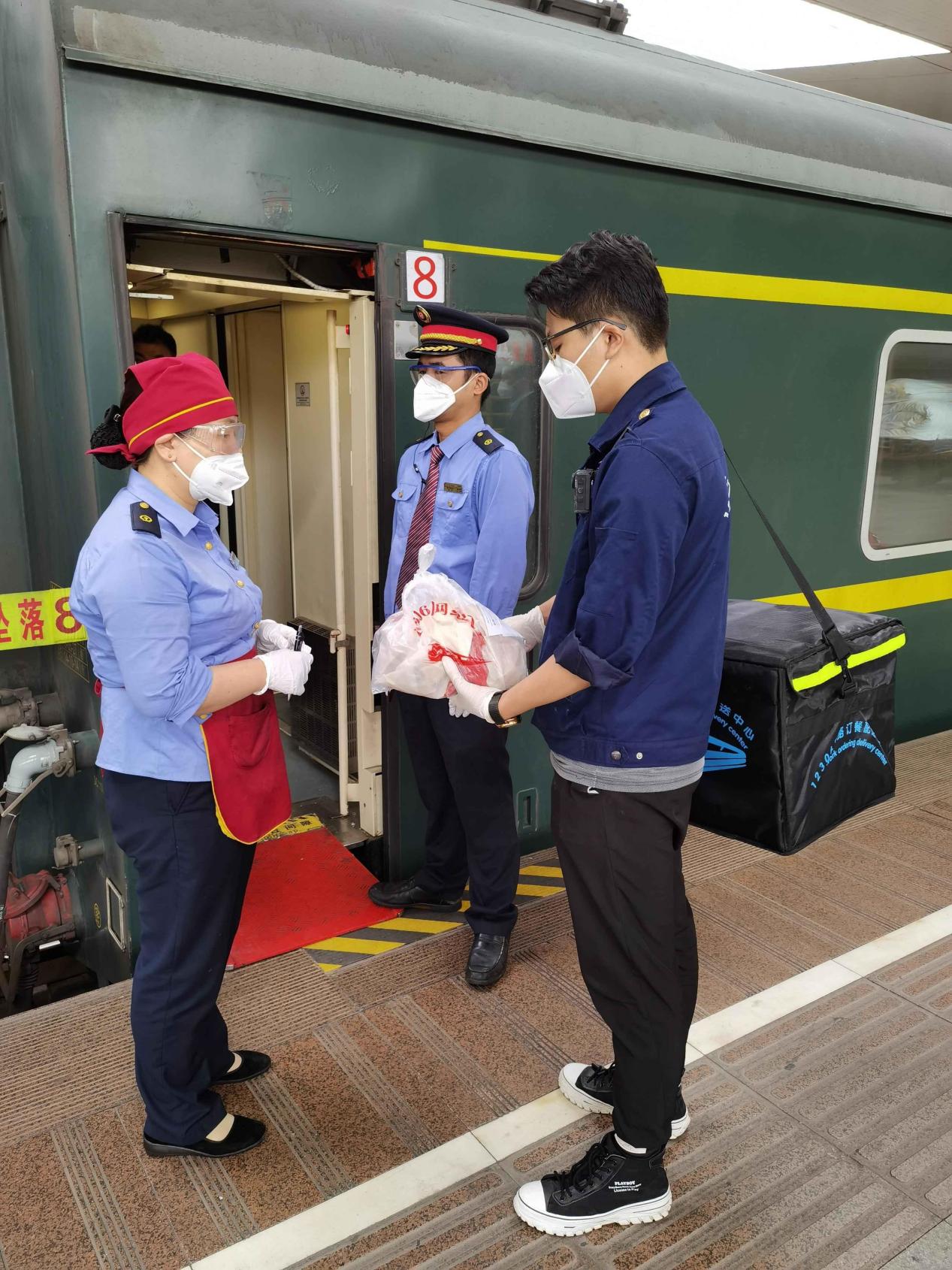 图为武昌站12306送餐人员与Z390次列车工作人员交接旅客预定餐品。(杨柳摄)