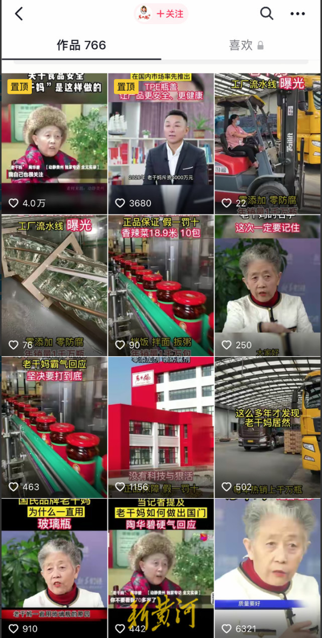 最近,陶华碧更“现身”抖音直播间。不过,陶华碧的流量效应并不算好。在老干妈抖音官方账号发布的700多条短视频中,点赞量最高的一条仅为4万。直播带货的成绩也不容乐观。据时代财经,灰豚数据显示,近3个月,老干妈抖音官方旗舰店新增粉丝数4.7万,直播销售额为80万元。