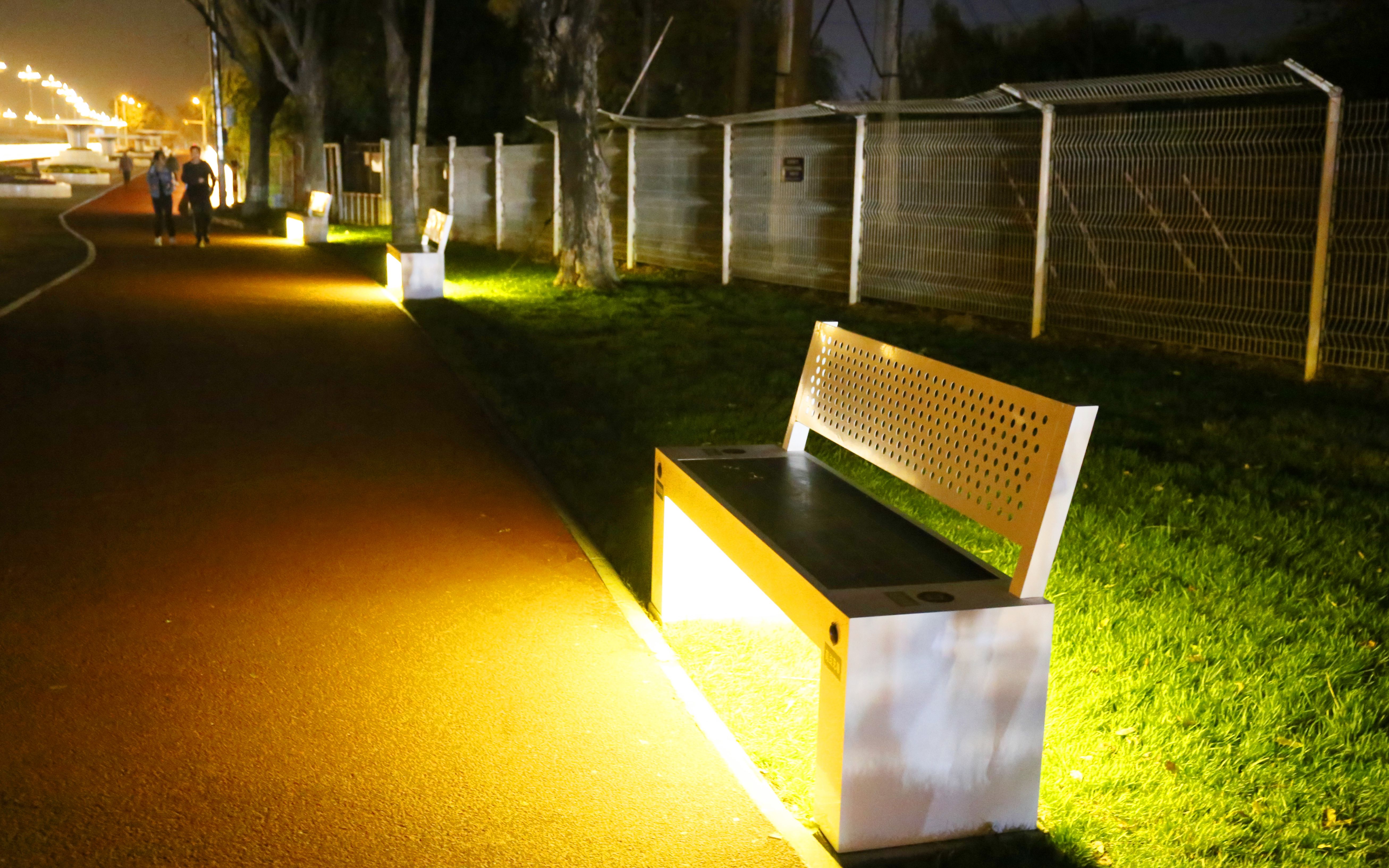 值得关注的是,旧俸伯桥上设置的是智能座椅,通过白天太阳能板蓄能,可实现有线和无线多种方式为居民手机等电子设备充电,夜间,居民通过座椅时,座椅下的灯光将自动点亮。