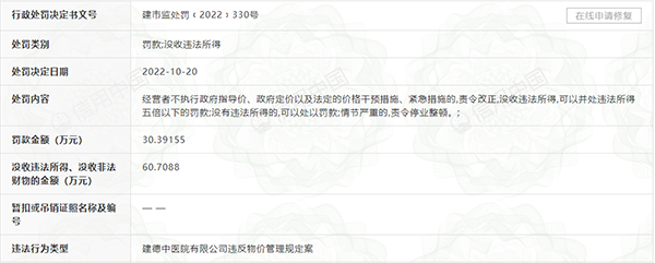 2022年9月5日,建德市市场监督管理局向该医院下发《责令退款通知书》(建市监责退〔2022〕001号),责令其退还多收价款。通报称,截止退款期限届满之日,建德中医院有限公司完成退款371.5元,未退还多收价款303544元。