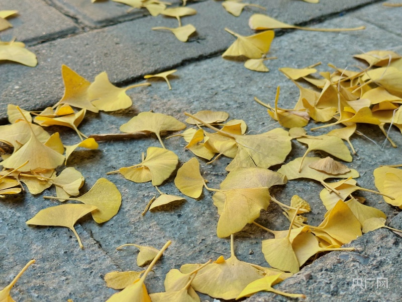 一阵秋风后,一把把金色的“小扇子”飘落一地(央广网记者李舜摄)
