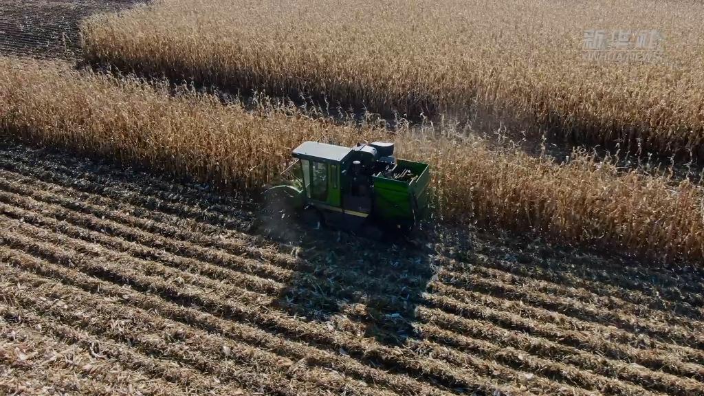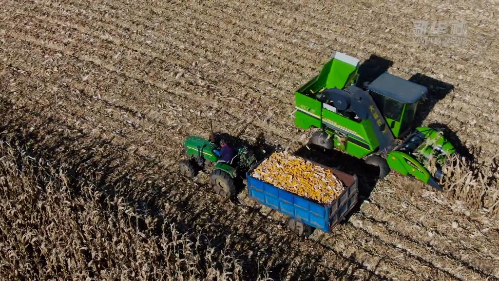 眼下,在黑龙江省牡丹江市,农户正抢抓晴好天气收割玉米。从天空俯瞰,广阔的玉米地仿佛一片金色的海洋。