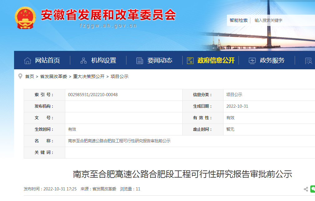 大皖新闻讯 10月31日,安徽省发改委网发布南京至合肥高速公路合肥段工程可行性研究报告审批前公示。
