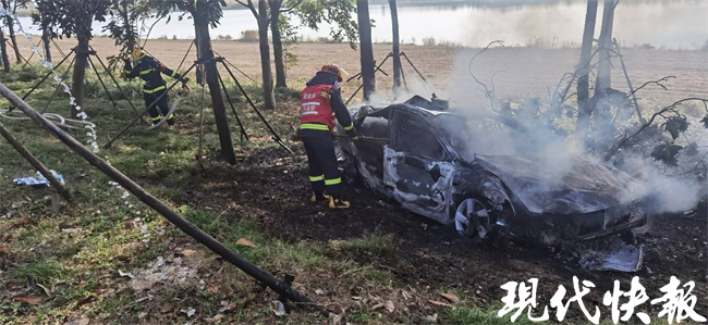 伤者安全了,周围群众还要考虑到。民警会同交警共同设立安全区域,疏散现场人员,待消防员将大火扑灭后才离开现场。火势控制后,车已经成了一副“骨架”。