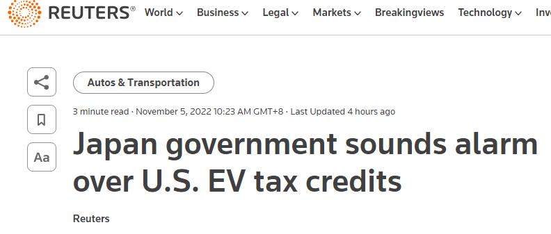 路透社称,几个月来,日本政府和本国汽车游说团体一直担心该法案会使日本汽车制造商在关键的北美市场中处于不利地位,上述说明表明这种担忧达到了顶点。
