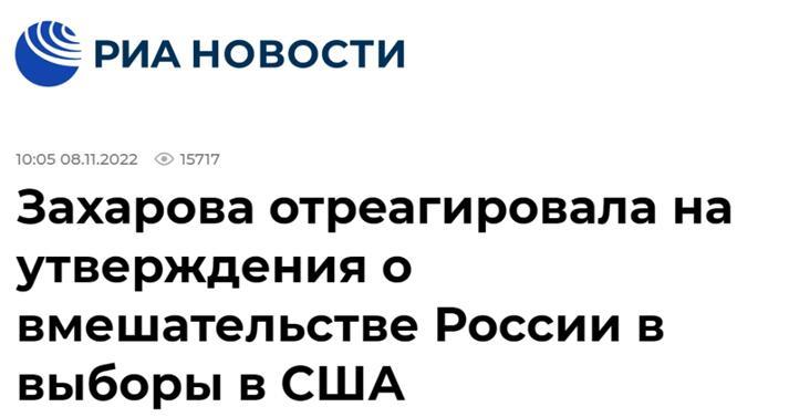 报道称,扎哈罗娃表示,“我感觉现在扰乱正常生活进程且干预美国选举的不是俄罗斯,而是特朗普”。不过,她并未明确说明,特朗普具体是如何干预美国选举的。俄新社和《俄罗斯商业咨询日报》均提到,扎哈罗娃此处的“美国选举”指的是“美国国会选举”。
