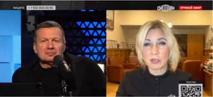 扎哈罗娃(右)接受索洛维约夫(左)采访,图源:俄罗斯“Vesti.ru”新闻网视频截图