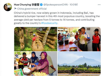 华春莹17日还发布了其他两组图片,其中一组照片是对印尼农业的现实写照,其配文称,“中国的杂交水稻目前在印尼(包括巴厘岛)广泛种植,在这个(世界)人口第四多的国家带来了丰收,使每公顷平均产量从5吨提高到14吨,对该国农业发展作出巨大贡献”。↓