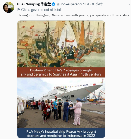 【环球网报道 记者 张晓雅】“古往今来,中国带来的是和平、繁荣和友谊。”中国外交部部长助理、发言人华春莹17日发布的这一推文,配上了一组时间跨度有6个世纪的对比图:15世纪,探险家郑和七下西洋,将丝绸和陶瓷带到了东南亚;2022年,中国海军“和平方舟”号医院船,为印度尼西亚带来了医生和药品。↓