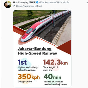 而在另一条推特中,华春莹发布的图片向世界展示了备受瞩目的中国和印尼合作建设的雅加达-万隆高铁项目(下称雅万高铁)。↓