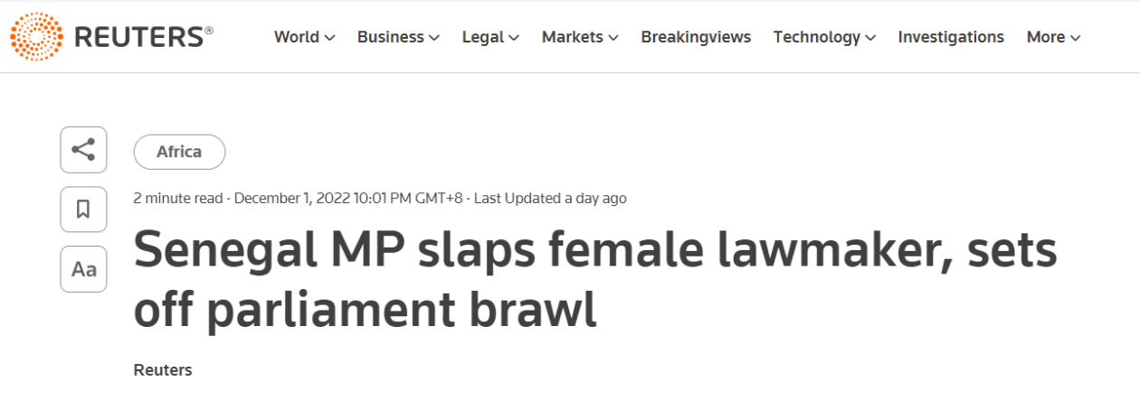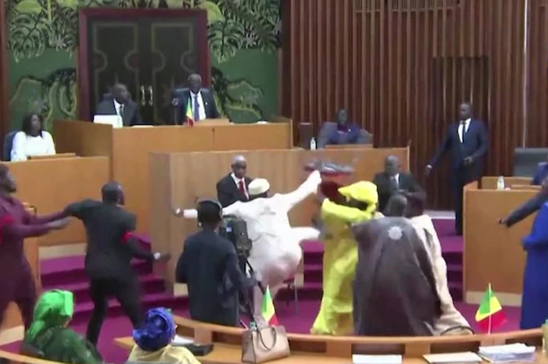 【环球网报道见习记者祁玥】综合路透社、澳大利亚广播公司报道,有视频显示,塞内加尔议会12月1日爆发了一场“暴力混战”,一名男议员掌掴了一名女议员后,女议员拿起一把椅子试图反击。