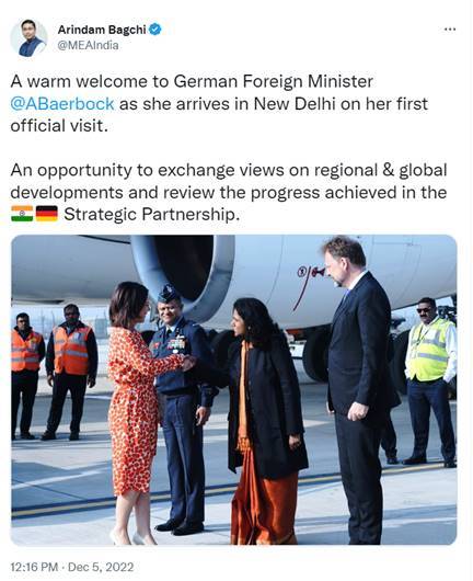 据新德里电视台报道,印度外交部长苏杰生5日对来访的德国外交部长贝尔伯克表示欢迎,印度外交部发言人阿林丹·巴格奇同日发推文称:“热烈欢迎德国外长,(这是她)抵达新德里(对印度)进行的首次正式访问,(这是)一个(双方)就区域和全球发展交换意见,并回顾印度和德国战略伙伴关系历程的好机会。”↓