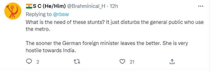 不过,对于贝尔伯克此次访问印度并乘坐地铁一事,有些印度网友持不同意见。有网友对她表示欢迎,但也有印度网友认为她此举是“噱头”,只会扰乱交通,并认为她应当尽快离开印度:“这些噱头有什么必要呢?这只会扰乱使用地铁的普通大众。德国外长越早离开越好。她对印度非常不友善。”↓