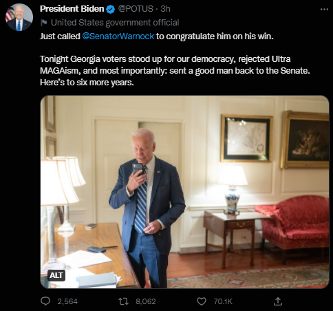 【环球网快讯】美国中期选举最后一场战役于6日在佐治亚州上演,民主党参议员拉斐尔·沃诺克在决选中获胜,这意味着民主党完全取得参议院控制权。当地时间6日晚些时候,美国总统拜登在社交媒体推特上发文,称已给沃诺克打了祝贺电话,并表示佐治亚州的选民拒绝了“极端MAGA(‘让美国再次伟大’)主义”。