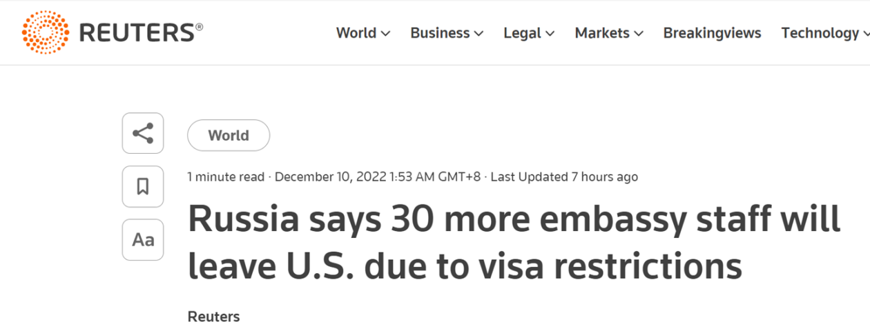 路透社:俄罗斯称因签证限制30多名俄外交官将离开美国
