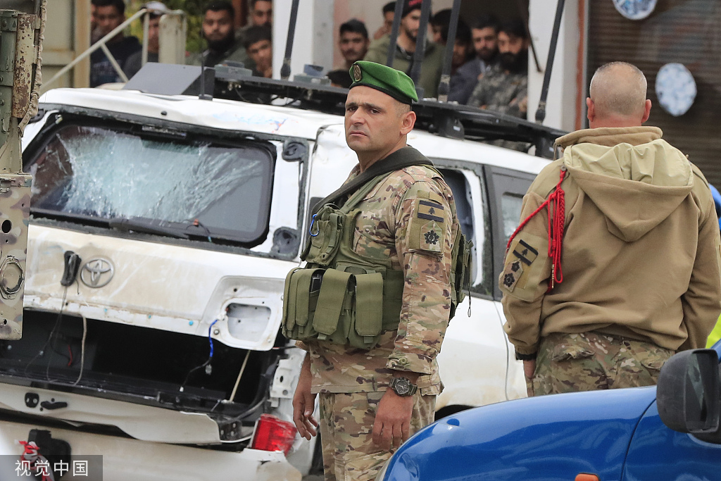 当地时间2022年12月15日,黎巴嫩南部阿克比亚村,联合国维和人员车队遭遇枪击,黎巴嫩士兵站在一辆被掀翻的车辆旁。视觉中国图