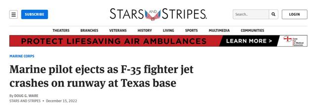《星条旗报》:F-35战斗机在得克萨斯州基地的跑道上坠毁,海军飞行员随即弹射
