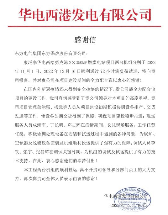 自项目启动以来,东方锅炉高度重视,各部门紧密配合,确保了设备如期交货,为2号锅炉顺利通过试运提供了坚实保障。整个项目设备性能参数得到业主充分肯定及认可,为此发来感谢信。