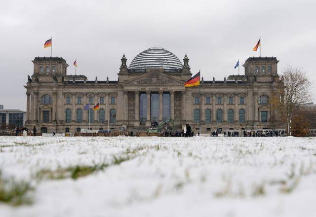 2022年11月20日,在德国柏林,德国国会大厦前的草坪被积雪覆盖。新华社发(斯特凡·蔡茨摄)