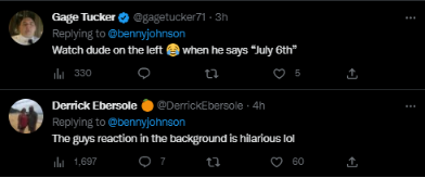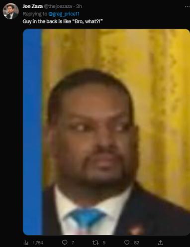 还有不少网友注意到拜登犯下这一口误的同时,其后方一名男子的表情亮了,“那个(在他)后面的男人就像(在说)‘兄弟,你在说啥?!’”“注意当他说‘7月6日’的时候那个左边的兄弟(表情)。”“那个后面男人的反应太好笑了哈哈。”↓