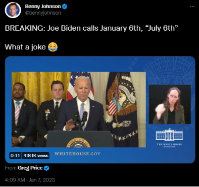 【环球网报道 记者 索炎琦】1月6日是2021年美国国会山骚乱事件两周年纪念日。据美国福克斯新闻网报道,美国总统拜登当地时间周五(6日)在白宫举行纪念活动,并发表演讲,然而讲话中拜登再次口误、搞错了“关键日期”,将“1月6日”说成了“7月6日”,引发网友吐槽。