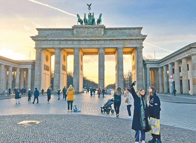 2月2日,游客在德国首都柏林著名的地标建筑勃兰登堡门前自拍。本报记者花放摄