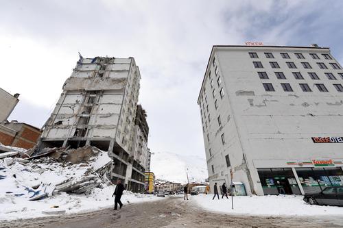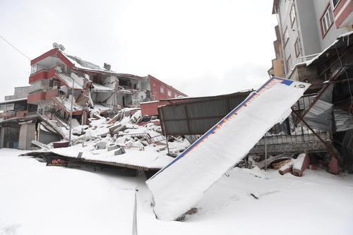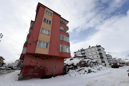 这是2月7日在土耳其卡赫拉曼马拉什省的埃尔比斯坦地区拍摄的地震中受损的建筑物。