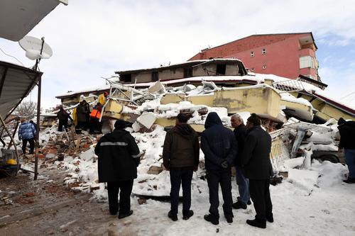 2月7日,在土耳其卡赫拉曼马拉什省的埃尔比斯坦地区,一名男子站在地震中受损的建筑物旁。