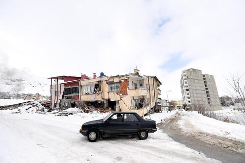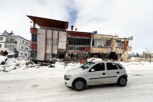 2月7日,在土耳其卡赫拉曼马拉什省的埃尔比斯坦地区,一辆汽车经过地震中受损的建筑物。