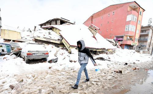 2月7日,在土耳其卡赫拉曼马拉什省的埃尔比斯坦地区,一名男子经过地震中受损的建筑物。