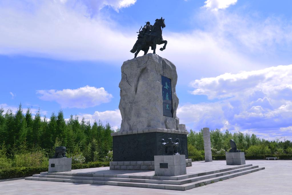 齐齐哈尔市碾子山区婆卢火广场中央的婆卢火铜像。(受访单位供图)