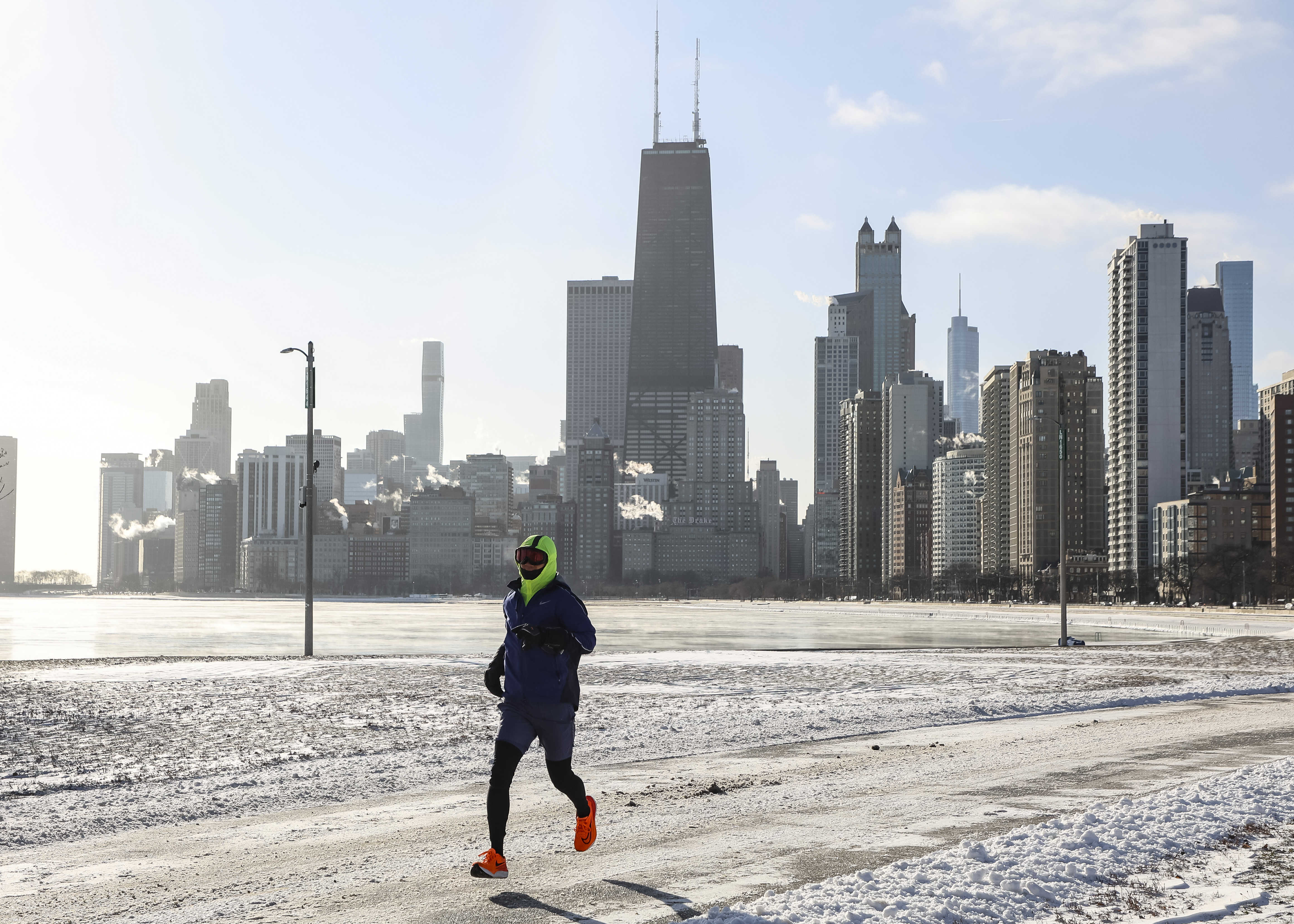 2022年12月24日,一名男子冒着严寒在美国芝加哥密歇根湖畔跑步。新华社发(乔尔·莱纳摄)