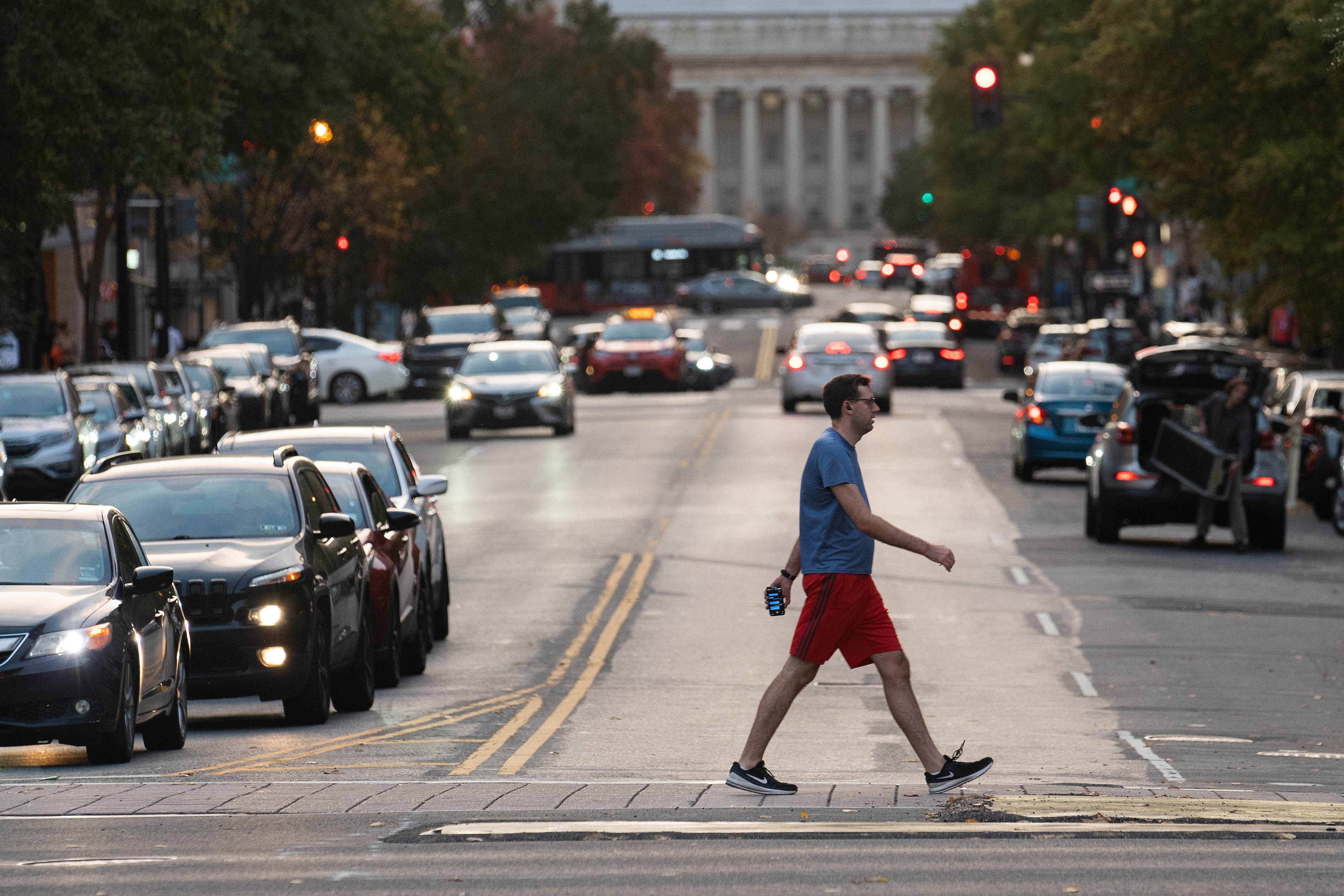 2022年11月4日,在美国首都华盛顿,行人在一处商业街区过马路。新华社记者刘杰摄