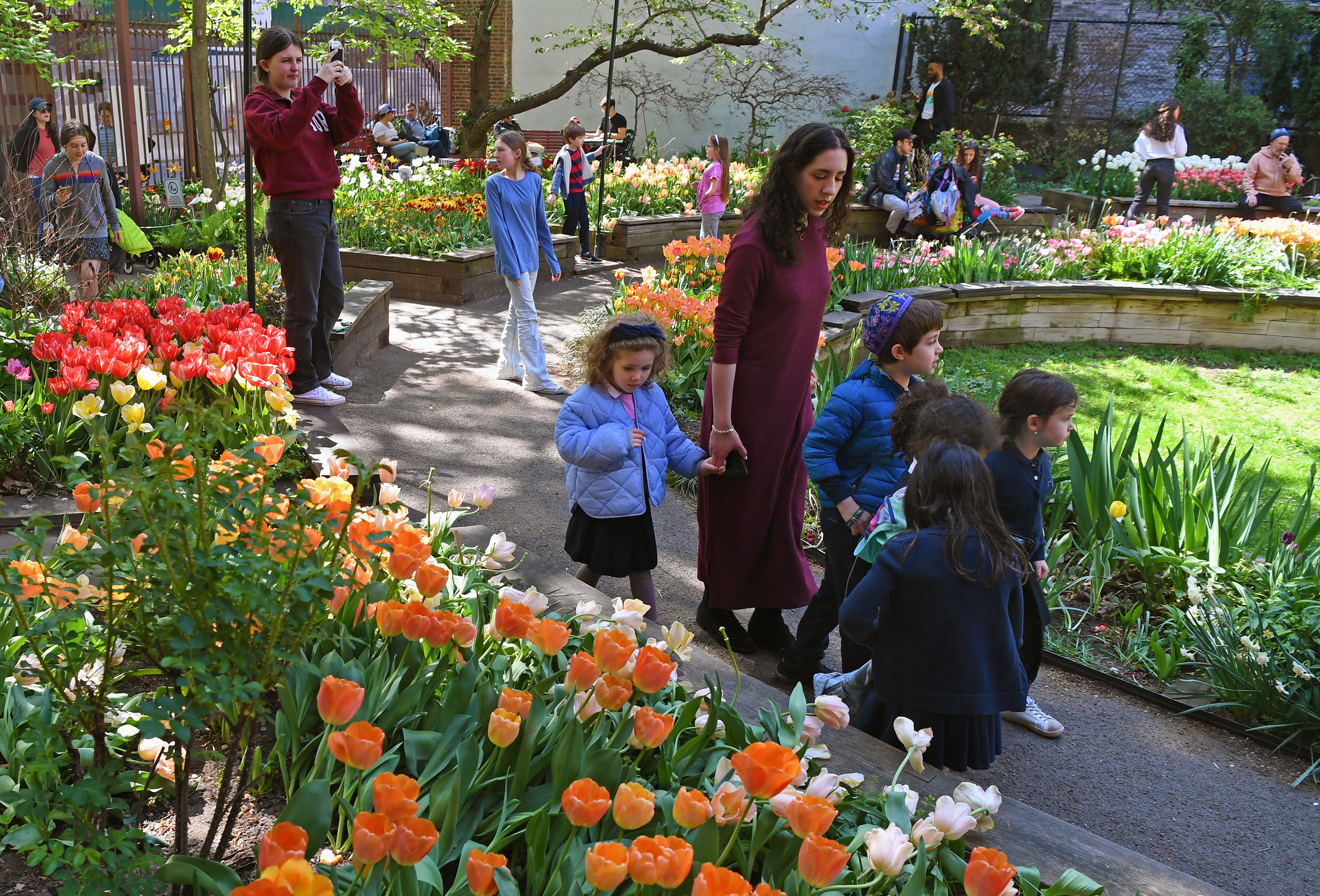 4月20日,在美国纽约的一处花园,人们在盛开的郁金香附近休闲。新华社记者李睿摄