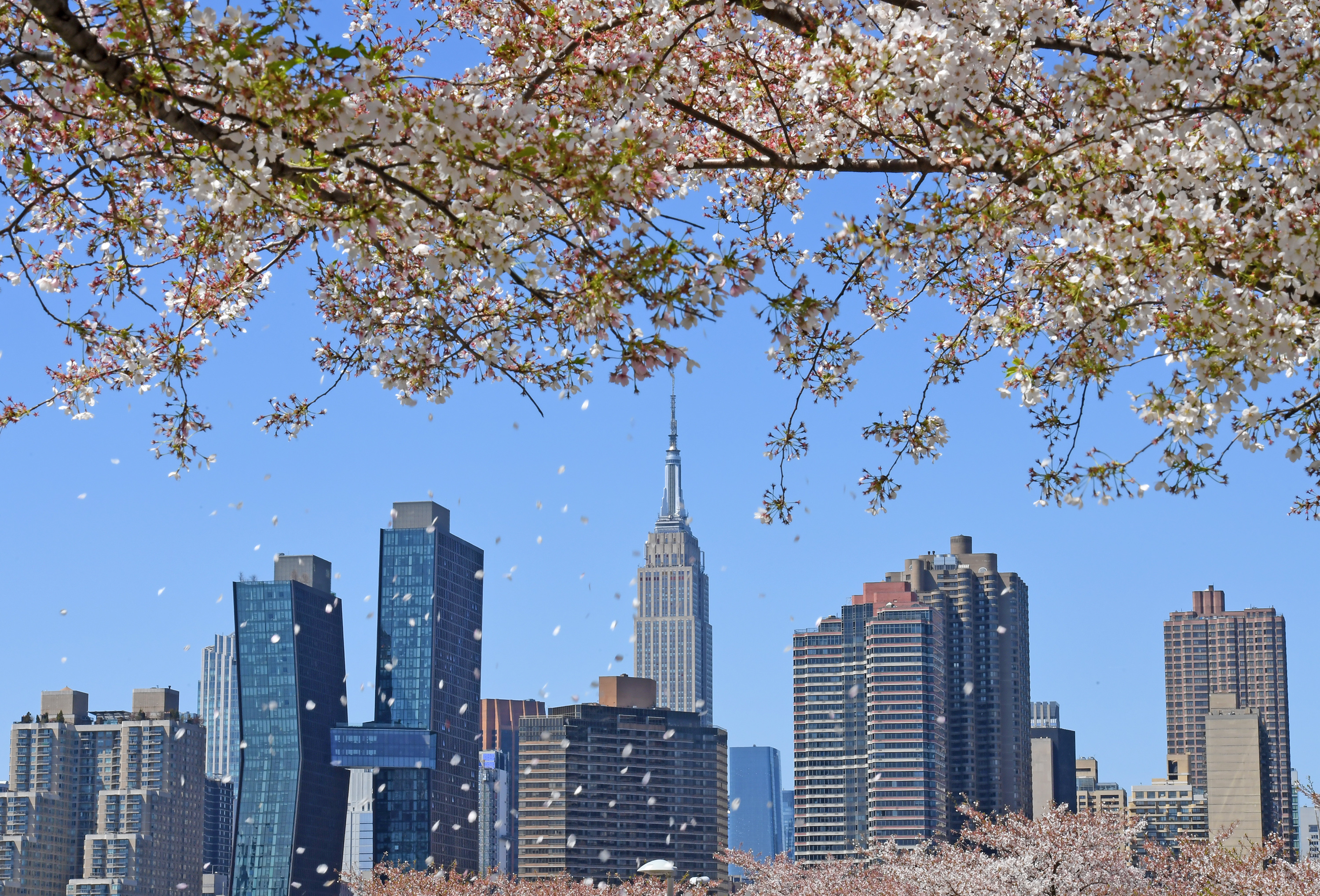 4月12日,在美国纽约,樱花掩映远处的帝国大厦(中)。新华社记者李睿摄