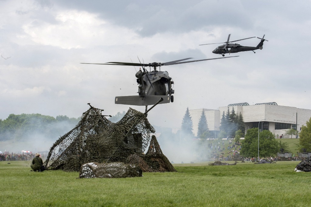 2016年5月14日,在立陶宛维尔纽斯,两架美军黑鹰直升机参加表演。新华社发(阿尔弗雷达斯·普里亚迪斯摄)