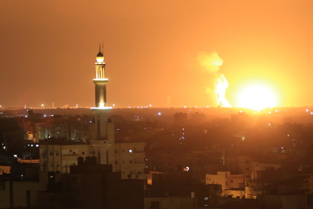 这是5月9日凌晨拍摄的加沙地带汗尤尼斯遭以军空袭的照片。新华社发(亚西尔摄)