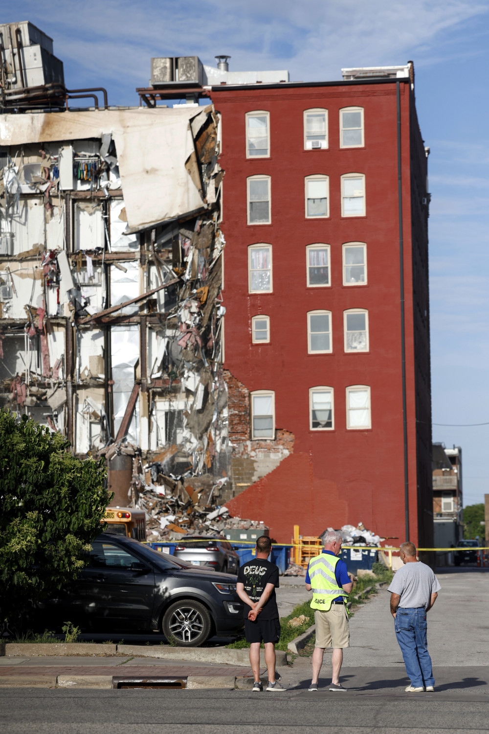 5月28日,人们聚集在美国艾奥瓦州达文波特的建筑物坍塌现场。新华社/美联