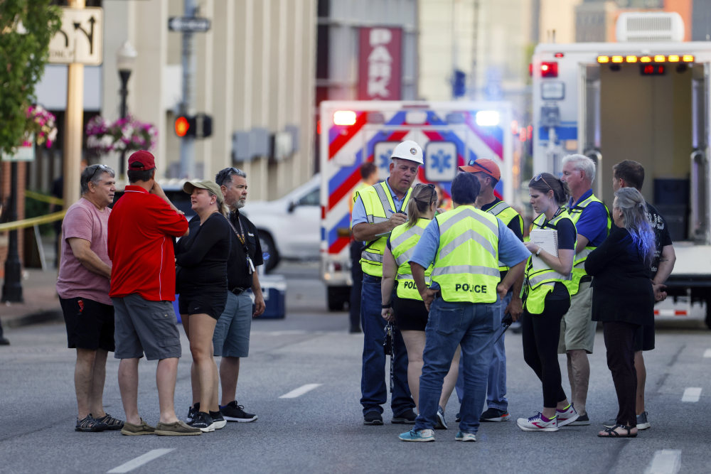 5月28日,警察在美国艾奥瓦州达文波特的建筑物坍塌现场附近工作。新华社/美联