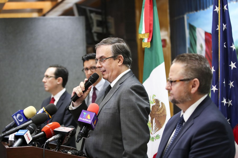 2019年8月5日,在美国得克萨斯州埃尔帕索的墨西哥驻埃尔帕索领事馆,墨西哥外长埃布拉德(左三)在记者会上讲话。新华社记者王迎摄