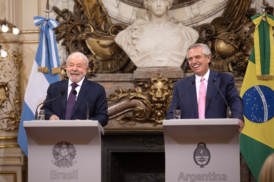 1月23日,在阿根廷布宜诺斯艾利斯,阿根廷总统费尔南德斯(右)和巴西总统卢拉在玫瑰宫出席新闻发布会。新华社发(马丁·萨巴拉摄)