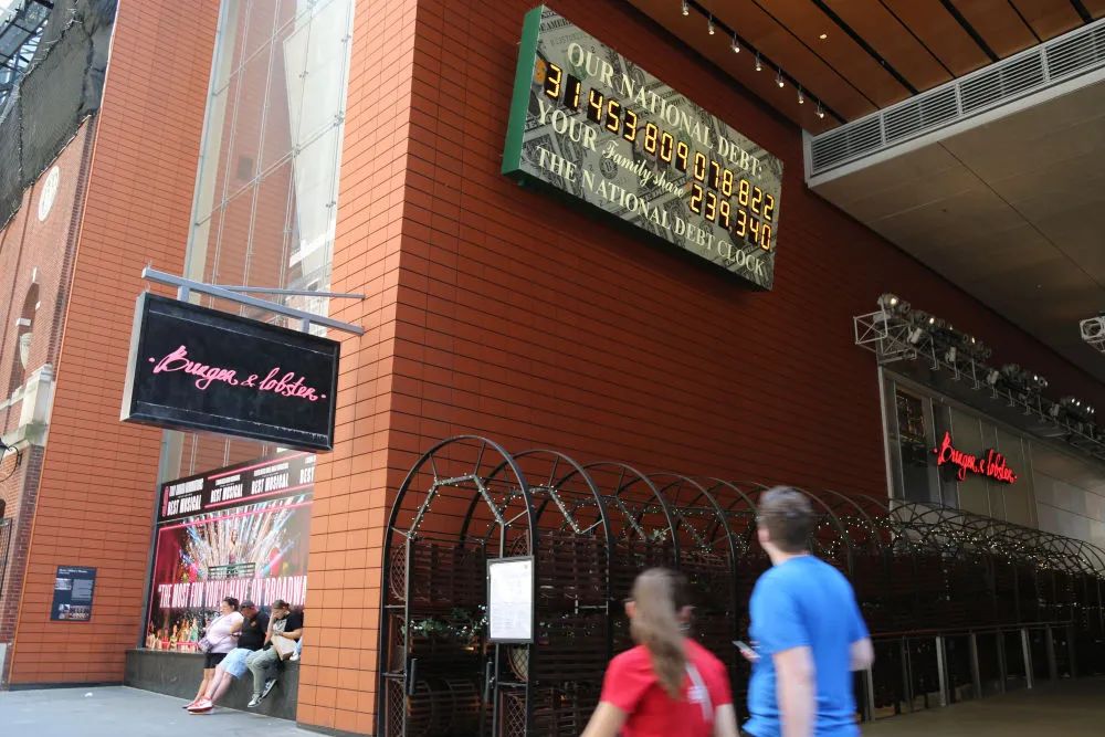 5月29日,人们经过美国纽约曼哈顿的“国债钟”。“国债钟”是一个大型计数器,它实时更新美国的公共债务总额,并显示出每个美国家庭所要负担的数额。新华社记者刘亚南摄